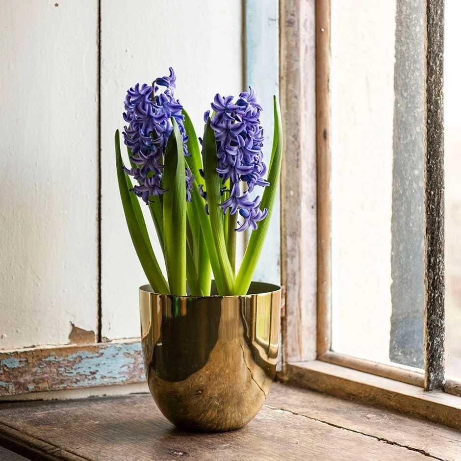 Stunning high-shine metallic pot cover made from steel with a polished brass exterior and powder-coated matt black interior. Supplied without drainage holes for indoor use.